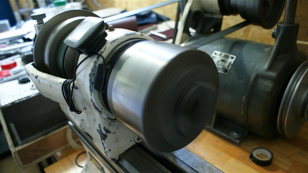 Grace a l'aide de Tony et Claude, le tour tourne ! Le variateur transforme le monophase en triphase pour alimenter le moteur Schaublin. La boite de commutation permet de passer de 750 a 1500 tr/min (horaire et inverse) couplé aux 3 positions de courroie du moteur et aux 3 positions des poulies du tour, ca donne 18 vitesses, assez pour vous donner le tournis. Pour avoir la vitesse de rotation du mandrin en tr/min j'ai utilisé un vieux compteur de vélo, en mettant 1667mm de circonference de roue, la vitesse (en km/h) affichée sur le compteur est egale au nombre de tours par minute (avec un facteur 10 cad 38 km/h = 380 tr/min).